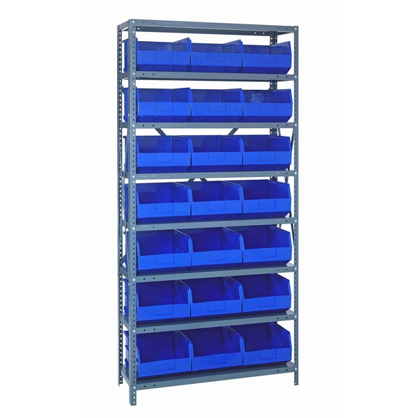 Shelving Unit, 12''D x 36''L x 75''H, heavy duty, 400 lb. load capacity per shelf, includes: 8 shelves, 21 14''L x 11''W x 7''H SSB445 blue black bins, uprights and cross bars, smooth powder-coat finish