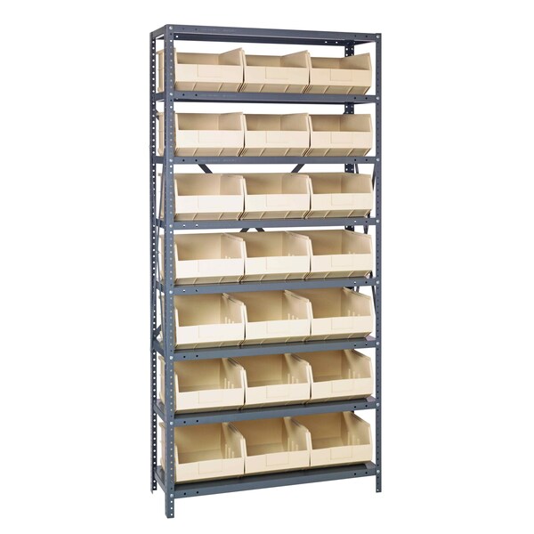 Shelving Unit, 24''D x 36''L x 75''H, heavy duty, 400 lb. load capacity per shelf, includes: 8 shelves, 21 20-1/2''L x 11''W x 7''H SSB485 ivory black bins, uprights and cross bars, smooth powder-coat finish