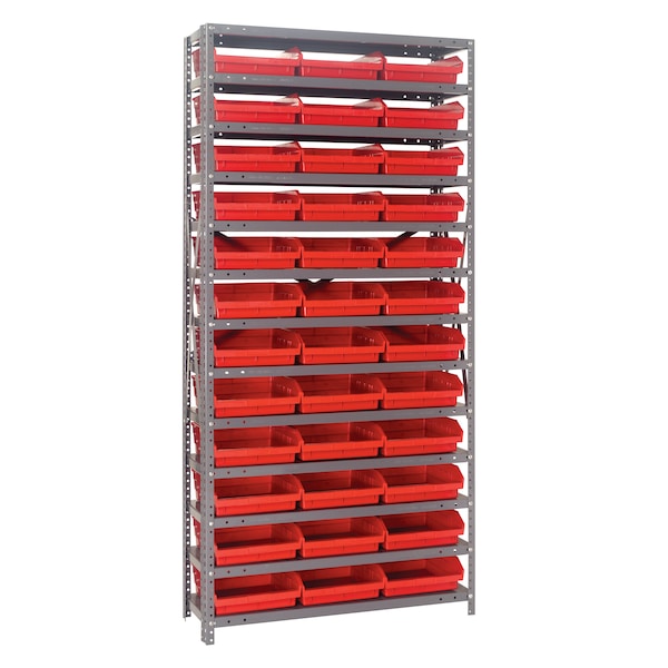 Economical small parts storage steel systems keep parts easily accessible. Open hopper front bins with label area provide fast access to store items. This all-in-one unit is easy to clean and will not rust or corrode. Heavy-duty, high grade shelving offers 400 lb. capacity per shelf. 36” wide shelving has a smooth powder coat finish. Bins re available in 7 colors.