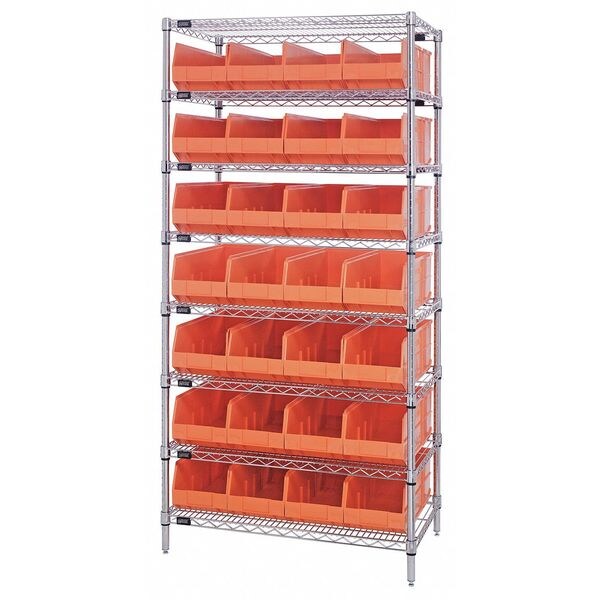 Bin Shelving, Bin Style Hang and Stack, Bin Material Polypropylene, Bin Height 7 in, Bin Depth 14 in, Bin Color Orange, NSF, Chrome, Bin Width 8 1/4 in, Includes Mfr. No. SSB443OR Bins, Overall Depth 14 in, Overall Height 74 in, Overall Width 36 in