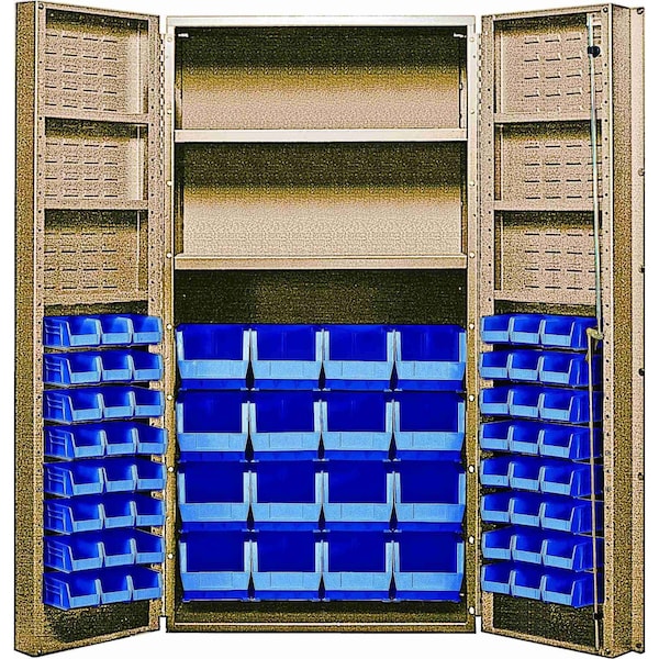 Heavy-Duty 36'' Bin Cabinet, 36''W x 24''D x 72''H, 800 lb. capacity per interior shelf and 60 lb. capacity per door shelf, 14 gauge all welded construction, includes: 2 interior and 6 door adjustable shelves; 16 QUS236 and 16 QUS240 blue bins, beige powder-coated finish