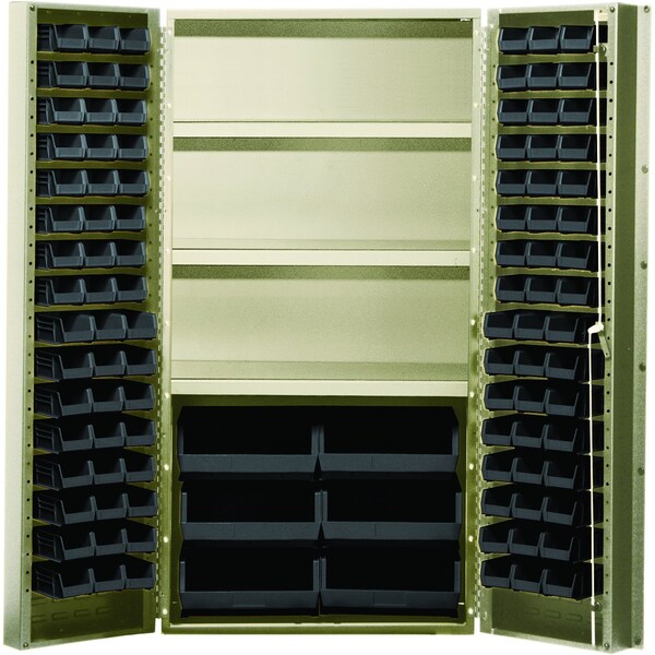 Heavy-Duty 36'' Bin Cabinet, 36''W x 24''D x 72''H, 800 lb. capacity per interior shelf, 14 gauge all welded construction, includes: 3 adjustable shelves, 16 QUS232, 16 QUS236 and 6 QUS250 black bins, beige powder-coated finish