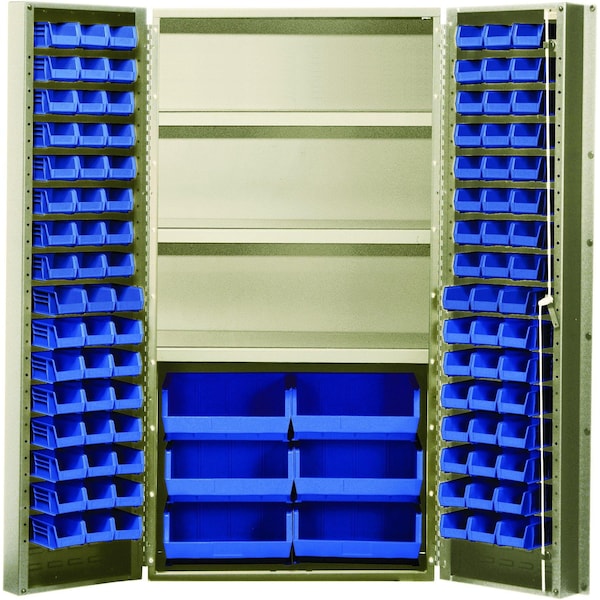Heavy-Duty 36'' Bin Cabinet, 36''W x 24''D x 72''H, 800 lb. capacity per interior shelf, 14 gauge all welded construction, includes: 3 adjustable shelves, 16 QUS232, 16 QUS236 and 6 QUS250 blue bins, beige powder-coated finish