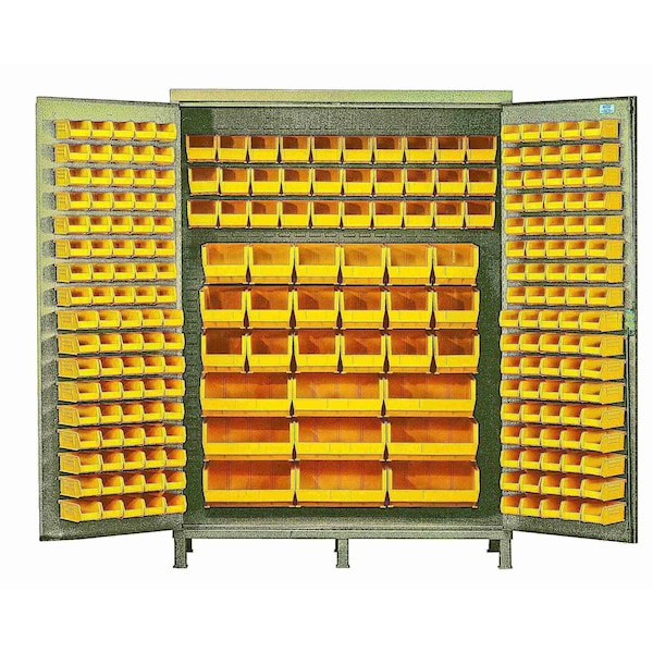 Heavy-Duty 72'' Bin Cabinet, 72''W x 24''D x 84''H, 500 lb. capacity per interior shelf, 14 gauge all welded construction, includes: 3 adjustable shelves, 32 QUS232, 32 QUS236, 8 QUS240 and 12 QUS250 yellow bins, beige powder-coated finish