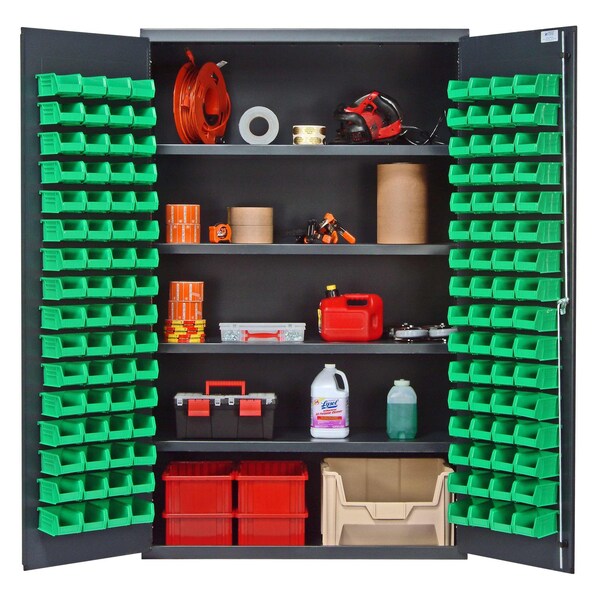 Heavy-Duty 48'' Bin Cabinet, 48''W x 24''D x 78''H, 400 lb. capacity per interior shelf, 14 gauge all welded construction, includes: 4 adjustable shelves and 128 QUS210 green bins, gray powder-coated finish