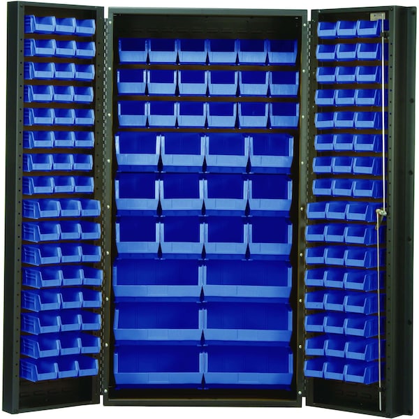 Heavy-Duty 36'' Bin Cabinet, 36''W x 24''D x 72''H, 14 gauge all welded construction, includes: 48 QUS210, 48 QUS220, 18 QUS230, 12 QUS240 and 6 QUS250 blue bins, gray powder-coated finish