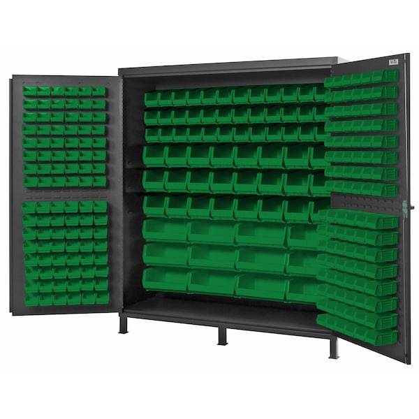 Heavy-Duty 72'' Bin Cabinet, 72''W x 24''D x 84''H, 14 gauge all welded construction, includes: 32 QUS232, 32 QUS236, 36 QUS230, 24 QUS240 and 12 QUS250 green bins, gray powder-coated finish