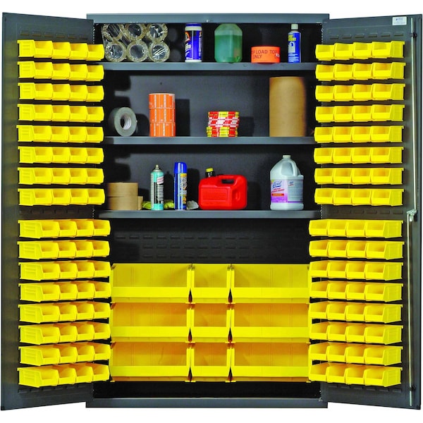 Heavy-Duty 48'' Bin Cabinet, 48''W x 24''D x 78''H, 400 lb. capacity per interior shelf, 14 gauge all welded construction, includes: 3 adjustable shelves, 64 QUS210, 64 QUS220, 3 QUS240 and 6 QUS250 yellow bins, gray powder-coated finish