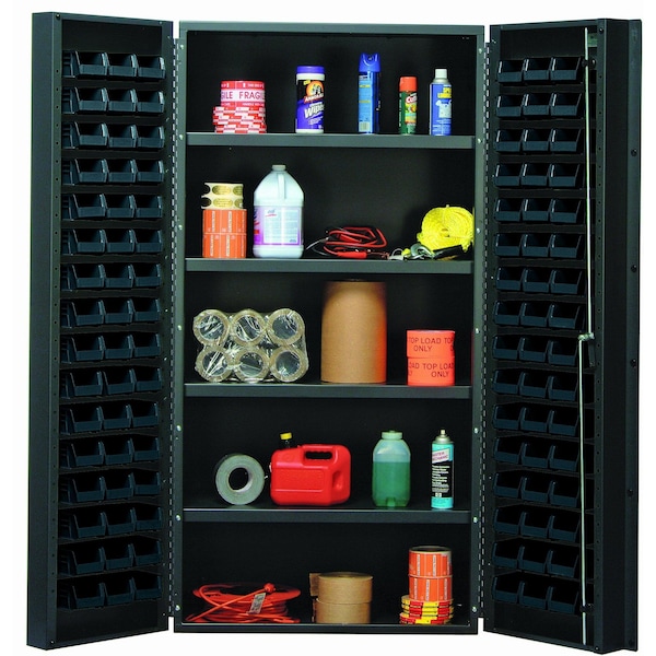 Heavy-Duty 36'' Bin Cabinet, 36''W x 24''D x 72''H, 800 lb. capacity per interior shelf, 14 gauge all welded construction, includes: 32 QUS232 black bins, gray powder-coated finish