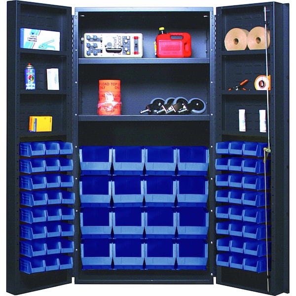 Heavy-Duty 36'' Bin Cabinet, 36''W x 24''D x 72''H, 800 lb. capacity per interior shelf and 60 lb. capacity per door shelf, 14 gauge all welded construction, includes: 2 interior and 6 door adjustable shelves; 16 QUS236 and 16 QUS240 blue bins, gray powder-coated finish