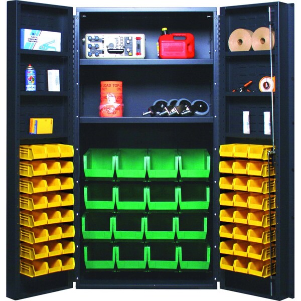 Heavy-Duty 36'' Bin Cabinet, 36''W x 24''D x 72''H, 800 lb. capacity per interior shelf and 60 lb. capacity per door shelf, 14 gauge all welded construction, includes: 2 interior and 6 door adjustable shelves; 16 QUS236 and 16 QUS240 clear bins, gray powder-coated finish
