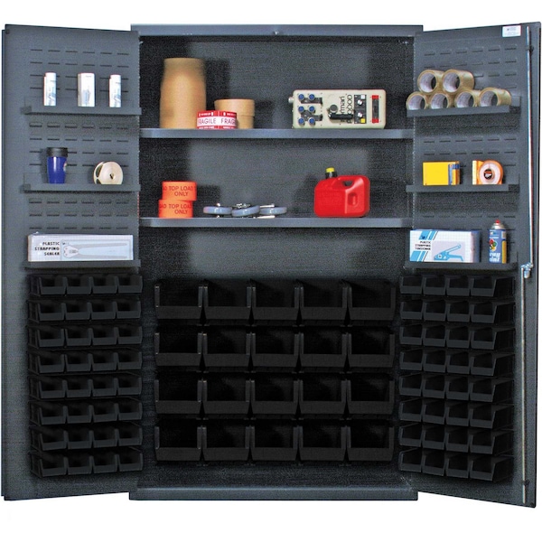 Heavy-Duty 48'' Bin Cabinet, 48''W x 24''D x 78''H, 400 lb. capacity per interior and 60 lb. per door shelf, 14 gauge all welded construction, includes: 2 adjustable interior and 6 door shelves; 20 QUS240 and 64 QUS220 black bins, gray powder-coated finish