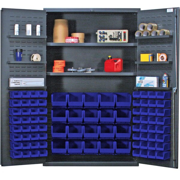 Heavy-Duty 48'' Bin Cabinet, 48''W x 24''D x 78''H, 400 lb. capacity per interior and 60 lb. per door shelf, 14 gauge all welded construction, includes: 2 adjustable interior and 6 door shelves; 20 QUS240 and 64 QUS220 blue bins, gray powder-coated finish