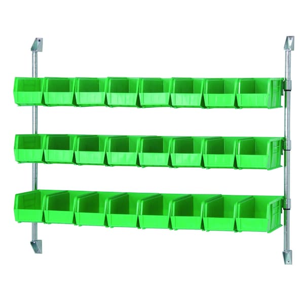 Cantilever Bin Holder Post Wall Mount, 48''W x 10-7/8''D x 34''H, includes: 3 bin rails, 24 green bins QUS230GN, 2 34'' posts, & 4 post wall brackets, chrome plated finish, NSF