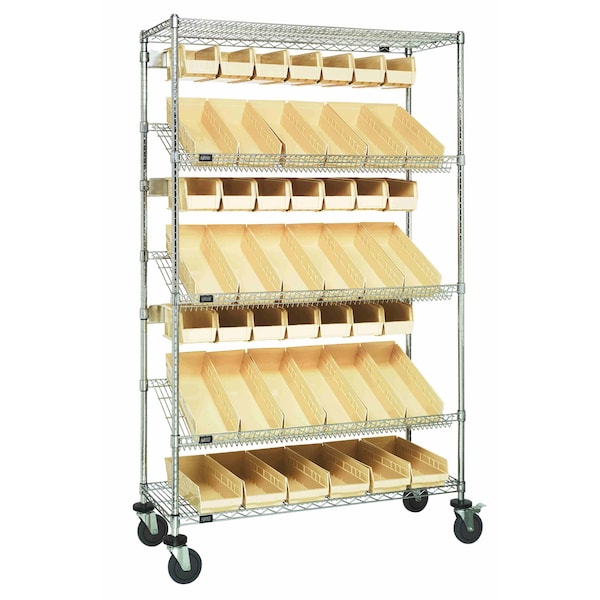 Slanted Shelf Cart, 36''W x 18''D x 80''H, 1200 lbs. load capacity, includes: 2 flat and 3 slanted shelves, 20 QSB104 and 18 QUS230 ivory bins, and casters with donut bumpers, chrome plated finish
