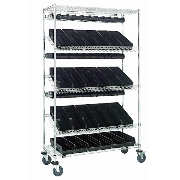 Slanted Shelf Cart, 36''W x 18''D x 80''H, 1200 lbs. load capacity, includes: 2 flat and 3 slanted shelves, 20 QSB104 and 24 QUS220 black bins, and casters with donut bumpers, chrome plated finish