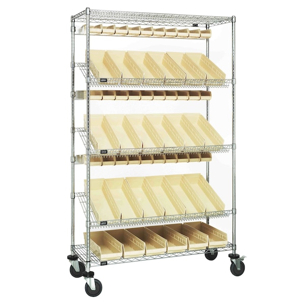 Slanted Shelf Cart, 48''W x 18''D x 80''H, 1200 lbs. load capacity, includes: 2 flat and 3 slanted shelves, 20 QSB104 and 30 QUS220 ivory bins, and casters with donut bumpers, chrome plated finish
