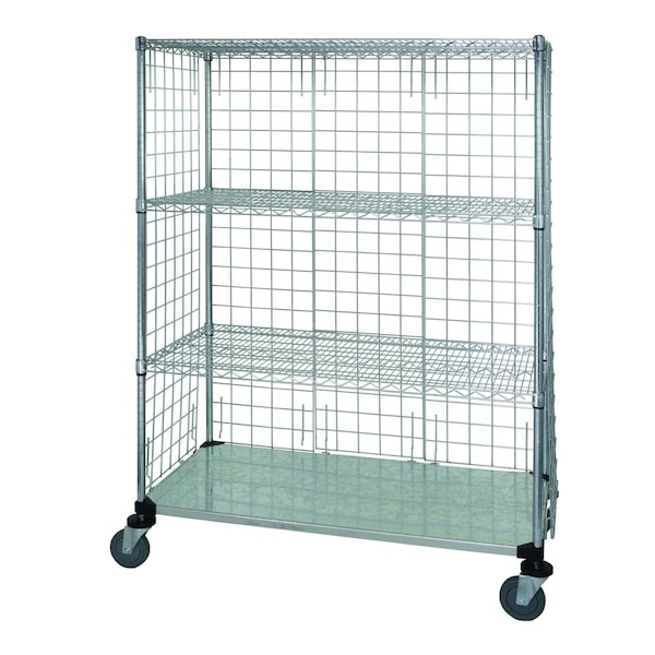 Wire Enclosed Cart, mobile, 48''W x 24''D x 69''H, 1200 lb. capacity, includes: 3 wire shelves, 1 solid galvanized steel shelf, 4 63''H post, 4 enclosure panels, 4 donut bumpers, 4 5'' thermoplastic resin casters, chrome plated finish