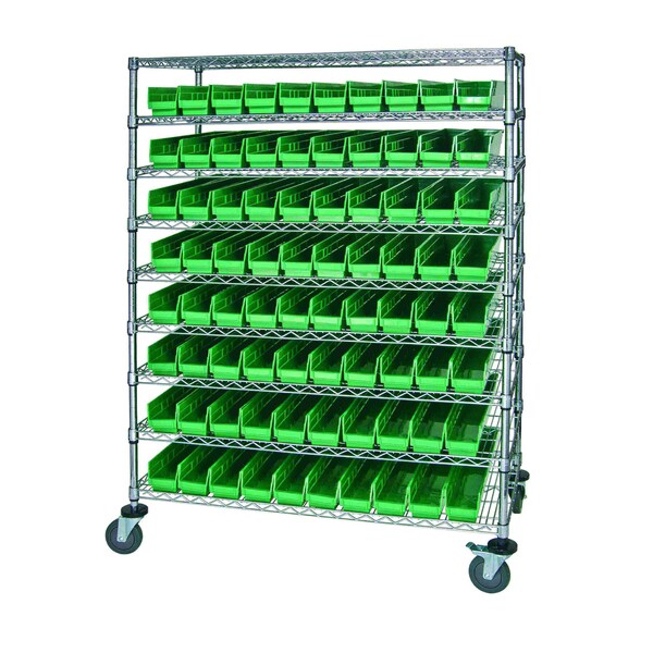 Catheter Bin Wire Cart, 48''W x 24''D x 69''H, 1200 lbs load capacity, includes: 9 shelves and 80 QSB105 green bins, chrome plated finish, shipped KD