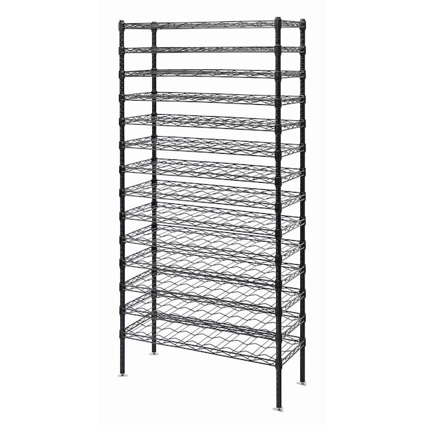 Wine Cradle Shelving Unit, wire, 36''W x 14''D x 74''H, holds up to 126 bottles, includes: 14 cradle shelves, 4 posts, foot plates and wall brackets, black epoxy antimicrobial finish