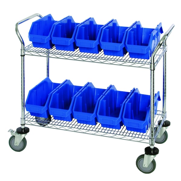 Utility Cart, 36''W x 18''D x 37-1/2''H, includes: 2 wire shelves, 10 12-1/2''W x 6-5/8''D x 5''H QP1265 blue bins and 2 swivel casters, 2 with brake, chrome plated finish, shipped KD