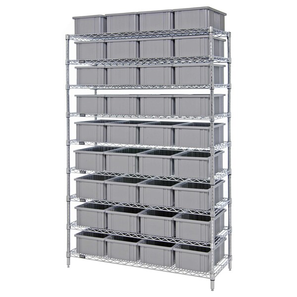 Bin Wire Shelving System, 60''W x 24''D x 74''H overall size, 600 lb. capacity per shelf, includes: 9 wire shelves, 4 posts, and 24 DG92060 gray containers, chrome plated finish