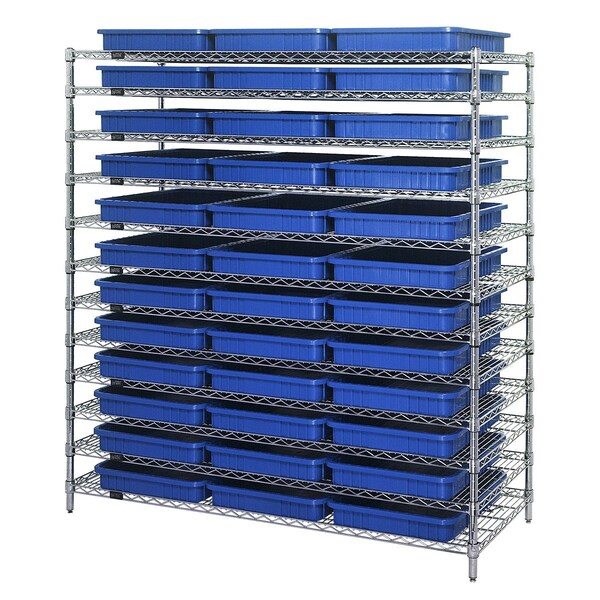 Bin Wire Shelving System, 60''L x 24''D x 63''H, 800 lbs load capacity per shelf, includes: 12 shelves and 36 DG93030 blue containers, chrome plated finish, shipped KD