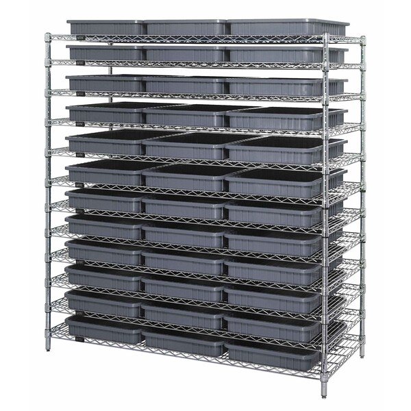 Bin Wire Shelving System, 60''L x 24''D x 63''H, 800 lbs load capacity per shelf, includes: 12 shelves and 36 DG93030 gray containers, chrome plated finish, shipped KD