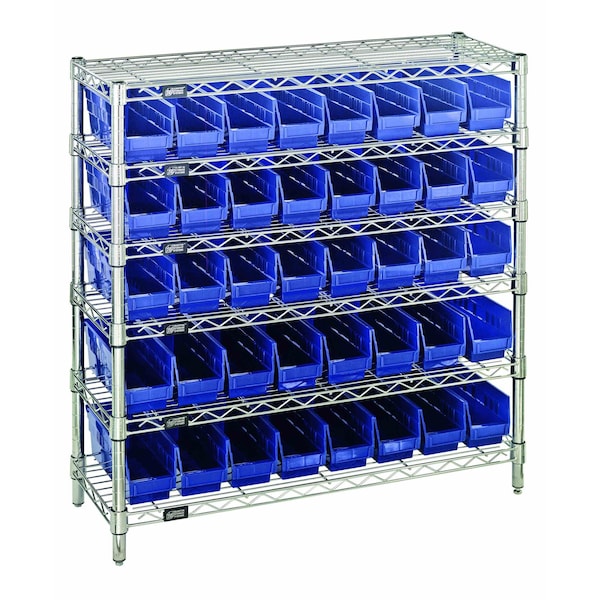 Bin Wire Shelving System, 36''W x 12''D x 36''H overall size, 800 lb. capacity per shelf, includes: 6 wire shelves, 4 posts, 40 QSB101 blue bins, chrome plated finish