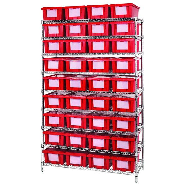 Bin Wire Shelving System, 48''W x 18''D x 74''H overall size, 800 lb. capacity per shelf, includes: 9 wire shelves, 4 posts, and 36 SNT180 red containers, chrome plated finish