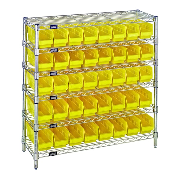 Bin Wire Shelving System, 36''W x 12''D x 36''H overall size, 800 lb. capacity per shelf, includes: 6 wire shelves, 4 posts, 40 QSB101 yellow bins, chrome plated finish