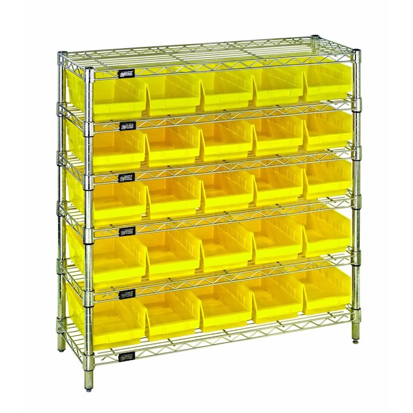 Bin Wire Shelving System, 36''W x 12''D x 36''H overall size, 800 lb. capacity per shelf, includes: 6 wire shelves, 4 posts, 25 QSB102 yellow bins, chrome plated finish