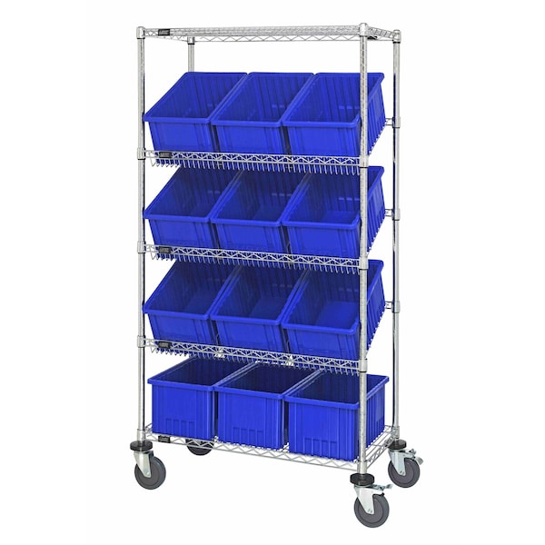 Bin Systems Unit, mobile, 36''W x 18''D x 69''H, includes: 4 posts, 2 flat wire shelves, 3 slanted wire shelves, 12 16-1/2''W x 10-7/8''D x 8''H blue bins DG92080 & 4 5'' swivel polyurethane casters 2 with brakes, blue, chrome plated finish, suitable for dry storage applications, shipped KD