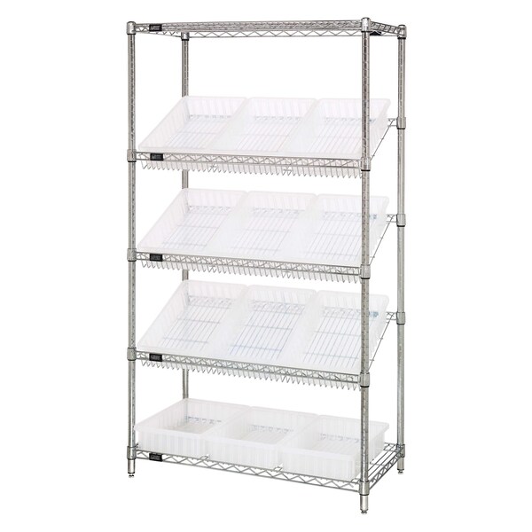 Bin Systems Unit, stationary, 36''W x 18''D x 63''H, includes: 2 flat wire shelves, 3 slanted wire shelves, 4 posts, & 12 16-1/2''W x 10-7/8''D x 3-1/2''H clear bins DG92035CL, chrome plated finish, NSF, shipped KD