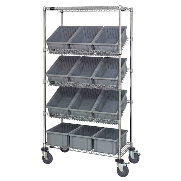 Bin Systems Unit, mobile, 36''W x 18''D x 69''H, includes: 4 posts, 2 flat wire shelves, 3 slanted wire shelves, 12 16-1/2''L x 10-7/8''W x 6''H gray bins DG92060 & 4 5'' swivel polyurethane casters 2 with brakes, gray, chrome plated finish, suitable for dry storage applications, shipped KD