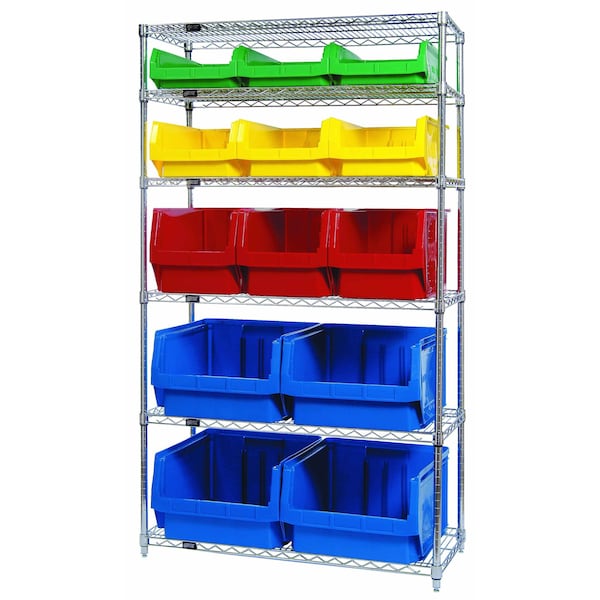 Bin Wire Shelving System, 42''W x 18''D x 74''H, 800 lbs load capacity per shelf, includes: 6 shelves, 4 QMS543 blue, 3 QMS533 red, 3 QMS532 yellow and 3 QMS531 green bins, chrome plated finish, shipped KD
