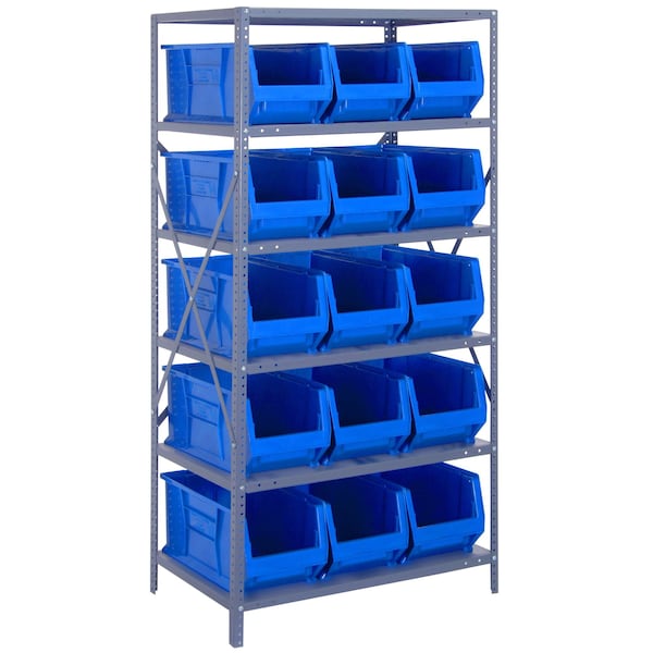 Shelving Unit, 24''D x 36''L x 75''H, heavy duty, 400 lb. load capacity per shelf, includes: 8 shelves, 15 23-7/8''L x11''W x 10''H QUS953 blue black bins, uprights and cross bars, smooth powder-coat finish