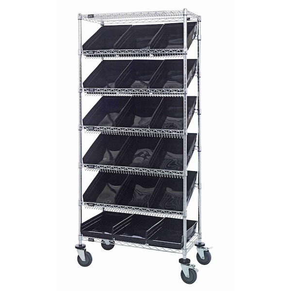 Bin Systems Unit, mobile, 36''L x 18''W x 80''H, includes: 4 posts, 2 flat wire shelves, 5 slanted wire shelves, 18 17-7/8''L x 11-1/8''W x 4''H black bins QSB110 & 4 5'' swivel polyurethane casters 2 with brakes, chrome plated finish, suitable for dry storage applications, shipped KD