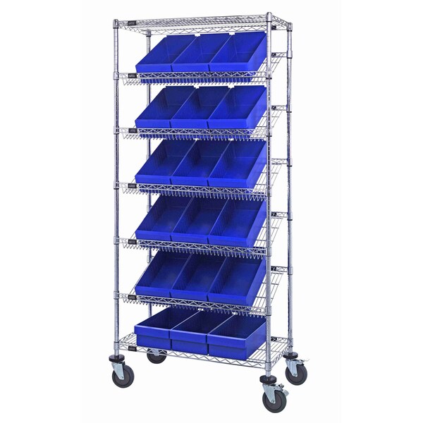 Bin Systems Unit, mobile, 36''L x 18''W x 80''H, includes: 4 posts, 2 flat wire shelves, 5 slanted wire shelves, 18 17-5/8''L x 8-3/8''W x 4-5/8''H blue bins QED606 & 4 5'' swivel polyurethane casters 2 with brakes, chrome plated finish, suitable for dry storage applications, shipped KD