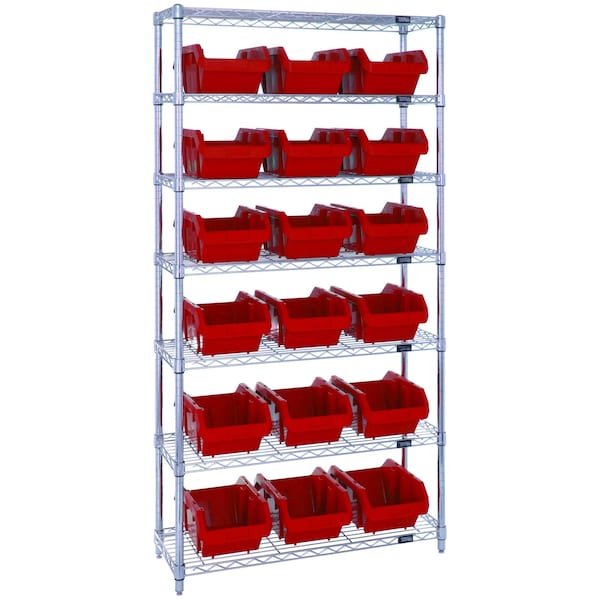 Bin System Unit, stationary, includes: 4 posts, 7 wire shelves and 18 14''L x 8-1/4''W x 6-1/2''H red bins QP1496, chrome plated finish, suitable for dry storage applications, shipped KD
