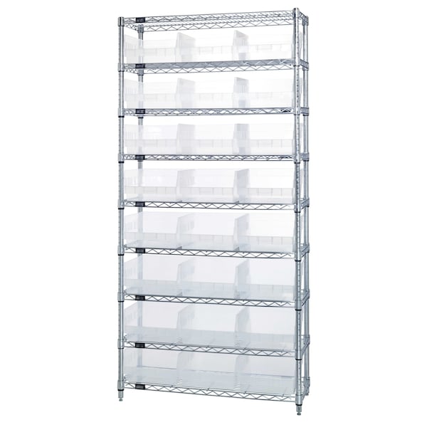 Bin Wire Shelving System, 36''W x 12''D x 74''H overall size, 800 lb. capacity per shelf, includes: 9 wire shelves, 4 posts, and 24 QSB209 clear bins, chrome plated finish
