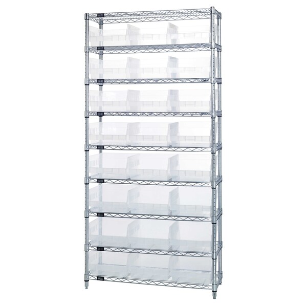 Bin Wire Shelving System, 36''W x 18''D x 74''H overall size, 800 lb. capacity per shelf, includes: 9 wire shelves, 4 posts, and 24 QSB210 clear bins, chrome plated finish