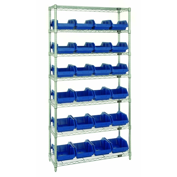 Bin System Unit, stationary, includes: 4 posts, 7 wire shelves and 24 12-1/2''L x 8-3/8''W x 5''H blue bins QP1285, chrome plated finish, suitable for dry storage applications, shipped KD