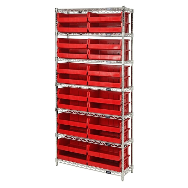 Bin Wire Shelving System, 36''W x 12''D x 74''H overall size, 800 lb. capacity per shelf, includes: 7 wire shelves, 4 posts, and 24 QUS245 red bins, chrome plated finish