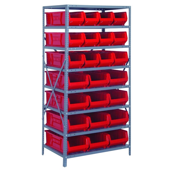 Shelving Unit, 24''D x 36''L x 75''H, heavy duty, 400 lb. load capacity per shelf, includes: 8 shelves, 12 23-7/8''L x 8-1/4''W x 7''H QUS950 and 12 23-7/8''L x 11''W x 7''H QUS952 red black bins, uprights and cross bars, smooth powder-coat finish