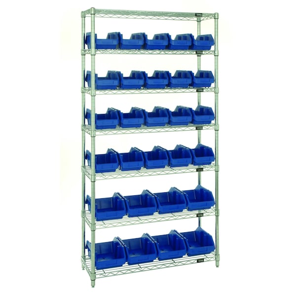 Bin System Unit, stationary, includes: 4 posts, 7 wire shelves, 20 12-1/2''L x 6-5/8''W x 5''H QP1265 and 8 12-1/2''L x 8-3/8''W x 5''H blue bins QP1285, chrome plated finish, suitable for dry storage applications, shipped KD