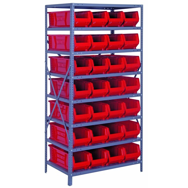 Shelving Unit, 24''D x 36''L x 75''H, heavy duty, 400 lb. load capacity per shelf, includes: 8 shelves, 28 23-7/8''L x 8-1/4''W x 7''H QUS950 red black bins, uprights and cross bars, smooth powder-coat finish