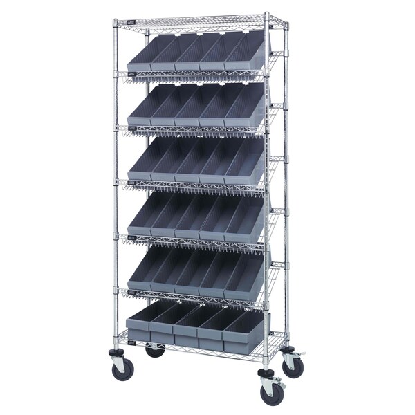 Bin Systems Unit, mobile, 36''L x 18''W x 80''H, includes: 4 posts, 2 flat wire shelves, 5 slanted wire shelves, 30 17-5/8''L x 5-9/16''W x 4-5/8''H gray bins QED602 & 4 5'' swivel polyurethane casters 2 with brakes, chrome plated finish, suitable for dry storage applications, shipped KD