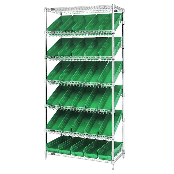Bin Systems Unit, stationary, 36''W x 18''D x 74''H, includes: 2 flat wire shelves, 5 slanted wire shelves, 4 posts, and 30 17-7/8''W x 6-5/8''D x 4''H green bins QSB104, chrome plated finish, NSF, shipped KD