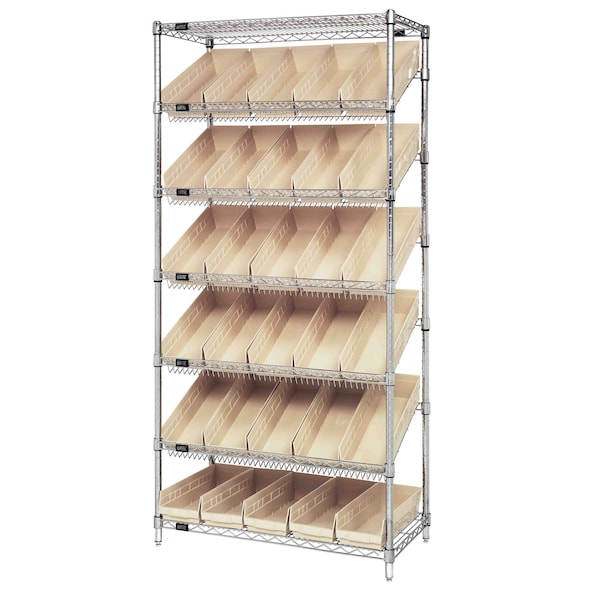 Bin Systems Unit, stationary, 36''W x 18''D x 74''H, includes: 2 flat wire shelves, 5 slanted wire shelves, 4 posts, and 30 17-7/8''W x 6-5/8''D x 4''H ivory bins QSB104, chrome plated finish, NSF, shipped KD